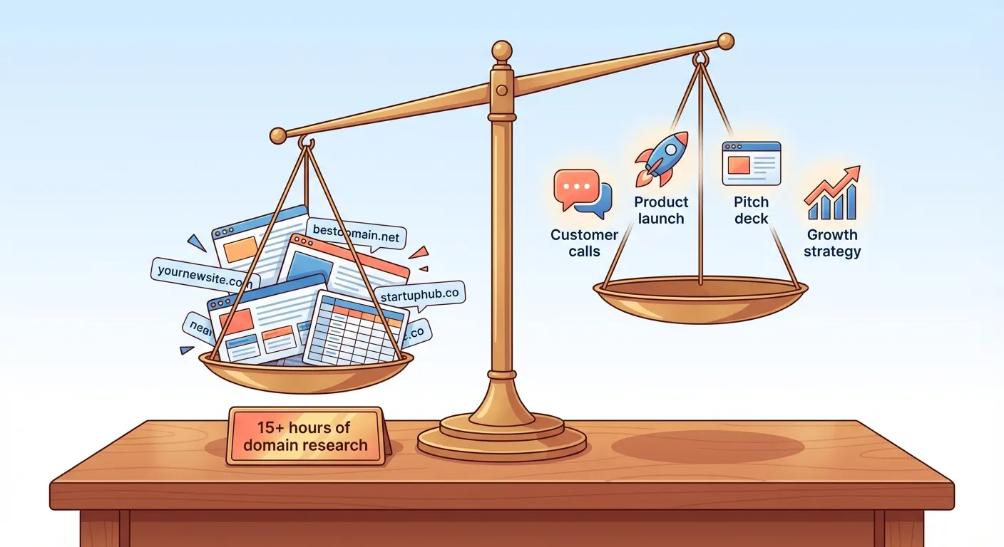 Time spent on domain research is time not spent on everything else your startup needs. And unlike most tasks, naming tends to happen at the worst possible moment - right before launch, when every hour matters.