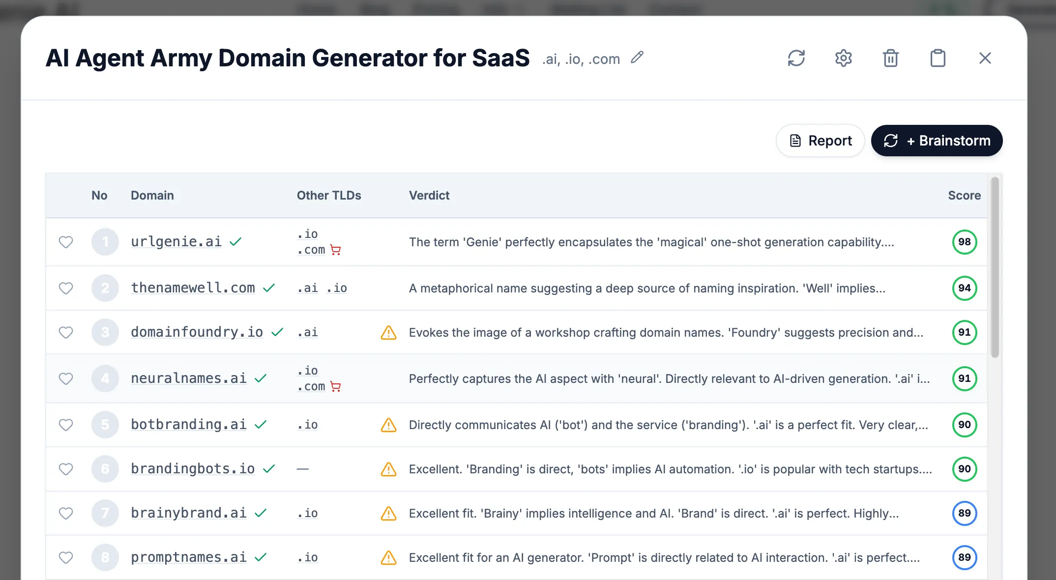 The result? A clean, professional table where the domain names are the star. Users can actually read and consider each option without visual fatigue. The interface finally respects that users are perfectly capable of judging a domain name themselves - they don't need a kaleidoscope of colors telling them what to think.